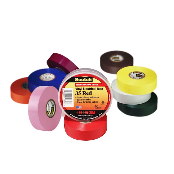 Electrical Tape, Polyvinyl Chloride Film, Tape Adhesive Material Rubber, 1/2 in, 6 5/8 yd, 7 mil, Series 35, Assorted, Minimum Tape Performance Temperature 14 Degrees F, Maximum Tape Performance Temperature 221 Degrees F, Voltage Rating 600 V, Continuous Roll, Single-Sided, Package Quantity 8