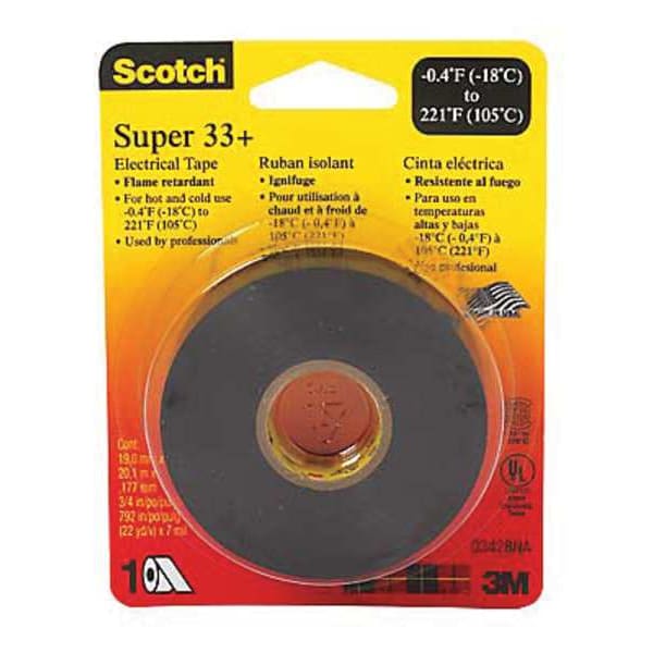 Electrical Tape, General Purpose, Vinyl, Tape Adhesive Material Rubber, 3/4 in, 17 3/8 yd, 7 mil, 3M(TM), Scotch(R), Series Super 33+, Black, Minimum Tape Performance Temperature 0 Degrees F, Maximum Tape Performance Temperature 221 Degrees F, Voltage Rating 600 V, Continuous Roll, Single-Sided, Package Quantity 100