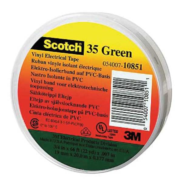 Electrical Tape, General Purpose, Vinyl, Tape Adhesive Material Rubber, 1/2 in, 6 5/8 yd, 7 mil, 3M(TM), Scotch(R), Series 35, Green, Minimum Tape Performance Temperature 14 Degrees F, Maximum Tape Performance Temperature 221 Degrees F, Voltage Rating 600 V, Continuous Roll, Single-Sided, Package Quantity 100