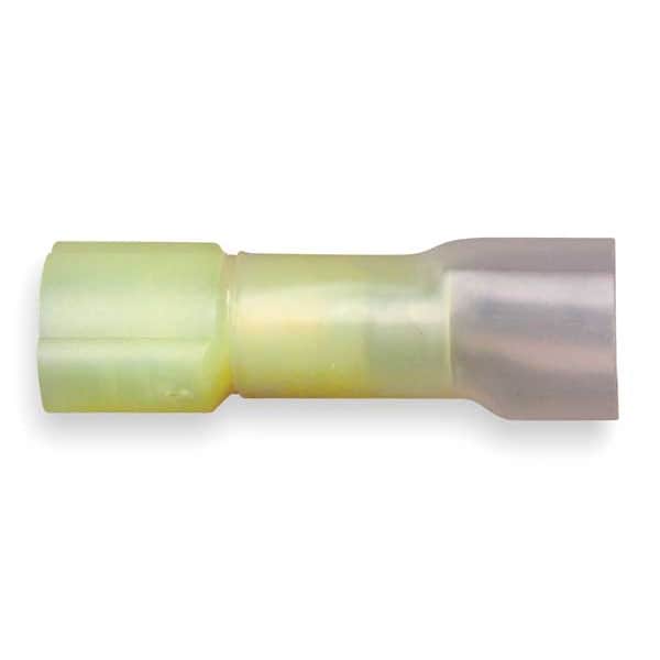 Female Disconnect, Contact Material Brass, Insulation Color Yellow, Insulation Coverage Full Coverage, Maximum Operating Temperature 221 Degrees F, Minimum Wire Size 12 AWG, Maximum Wire Size 10 AWG, Maximum Voltage 600 V, Tab Thickness 0.032 in, Tab Width 0.25 in, Terminal Type Female Disconnect, Termination Style Crimp, Seam Style Butted, Standards CSA Certified, RoHS Compliant, UL Listed, Barrel Inside Diameter 0.165 in, Insulation Type Heat Shrink, Overall Length 1.2 in, Package Quantity 25