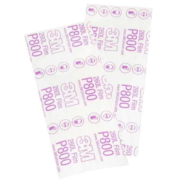 3M Film Sheet 260L is a film-backed abrasive that delivers best-in-class finishing performance in collision repair and other applications. It features aluminum oxide, 3M's longest-lasting, fastest-cutting abrasive, on a durable, film backing - ideal for paint prep and removing paint defects before compounding. This roll abrasive is part of the film-backed 3M abrasive family.