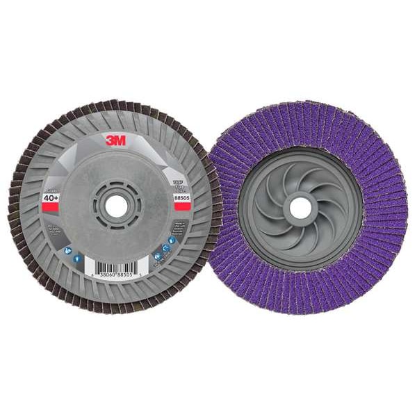 Flap Disc, Abrasive Type Coated, Abrasive Material Ceramic, Grade Coarse, Backing Plate Material Plastic, Connector Size 5/8 In.-11, Connector Type Threaded Hole, Density Rating Standard, Flap Disc Type Type 27, Overall Diameter 5 in, Series 769F, Backing Material Polyester, Backing Weight YF, Coating Coverage Open, Grit 40, Maximum Operating Speed 12,000 RPM, Features Trimmable