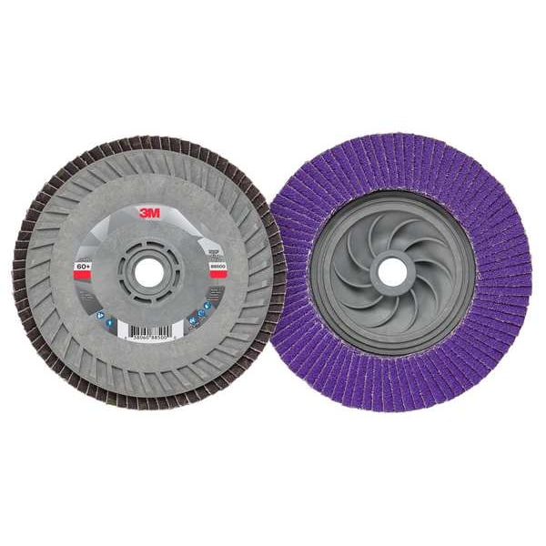 Flap Disc, Abrasive Type Coated, Abrasive Material Ceramic, Grade Medium, Backing Plate Material Plastic, Connector Size 5/8 In.-11, Connector Type Threaded Hole, Density Rating Standard, Flap Disc Type Type 29, Overall Diameter 5 in, Series 769F, Backing Material Polyester, Backing Weight YF, Coating Coverage Open, Grit 60, Maximum Operating Speed 12,000 RPM, Features Trimmable