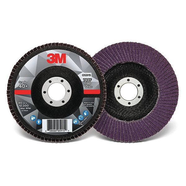 Flap Disc, Abrasive Type Coated, Abrasive Material Ceramic, Grade Coarse, Backing Plate Material Fiberglass, Connector Size 7/8 in, Connector Type Unthreaded Hole, Density Rating Standard, Flap Disc Type Type 27, Overall Diameter 5 in, Series 769F, Backing Material Polyester, Backing Weight YF, Coating Coverage Open, Grit 40, Maximum Operating Speed 12,000 RPM