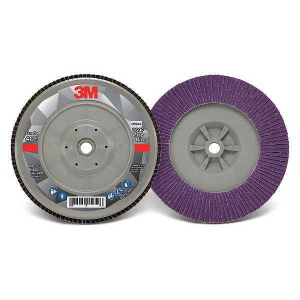 Flap Disc, Abrasive Type Coated, Abrasive Material Ceramic, Grade Coarse, Backing Plate Material Plastic, Connector Size 5/8 In.-11, Connector Type Threaded Hole, Density Rating Standard, Flap Disc Type Type 29, Overall Diameter 7 in, Series 769F, Backing Material Polyester, Backing Weight YF, Coating Coverage Open, Grit 40, Maximum Operating Speed 8,600 RPM, Features Trimmable