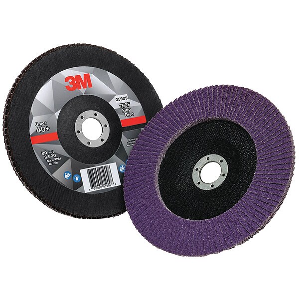 Flap Disc, Abrasive Type Coated, Abrasive Material Ceramic, Grade Coarse, Backing Plate Material Fiberglass, Connector Size 7/8 in, Connector Type Unthreaded Hole, Density Rating Standard, Flap Disc Type Type 27, Overall Diameter 7 in, Series 769F, Backing Material Polyester, Backing Weight YF, Coating Coverage Open, Grit 40, Maximum Operating Speed 8,600 RPM