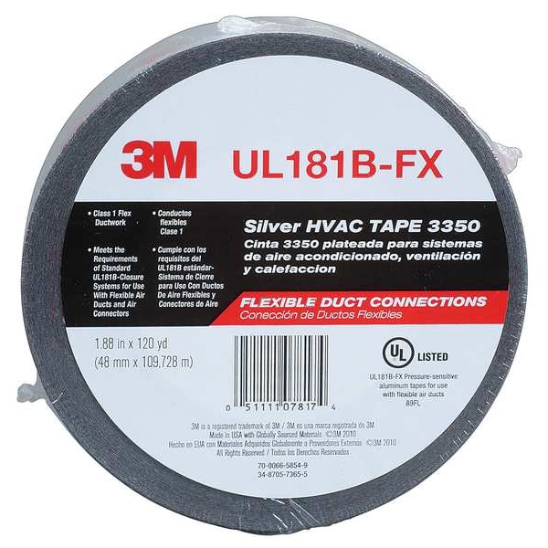 Adhesion to Steel 38 oz/in, Tape Brand 3M(TM), Construction, Warehouse, Environment Indoor/Outdoor, Imperial Tape Length 120 yd, Imperial Tape Width 1 7/8 in, Continuous Roll, Series 3350, Tape Adhesive Material Acrylic, Tape Backing Material Polyethylene Coated Cloth, Tape Color Silver, Tape Sub-Type Metalized Duct Tape, Tape Thickness 3.1 mil, Duct and Repair Tape, Maximum Tape Performance Temperature 185 Degrees F, Metric Tape Length 109 m, Metric Tape Width 47.6 mm