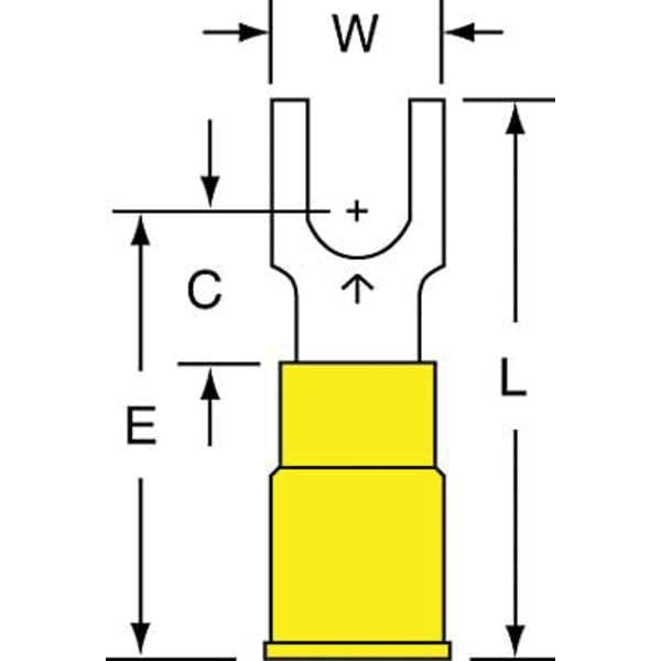 Fork Terminals, Contact Finish Tin, Contact Material Copper, Insulation Color Yellow, Insulation Material Vinyl, Maximum Temperature 221 Degrees F, Maximum Voltage 600 V, Maximum Wire Size 10 AWG, Stud Size #10, Termination Style Crimp, Seam Style Brazed, Standards CSA, RoHS 2011/65/EU, UL, Barrel Length 0.25 in, Barrel Style Brazed, Connection Material Copper, Connection Type Crimp, Minimum Operating Temperature -40 Degrees F, Minimum Wire Size 12 AWG, Overall Length 1.03 in