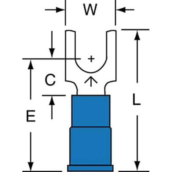 Fork Terminal, Insulation Color Blue, Stud Size #10, Standards CSA Certified, UL Listed, Connection Material Copper, Connection Type Crimp, Insulation Type Vinyl, Overall Length 0.85 in, Package Quantity 1000