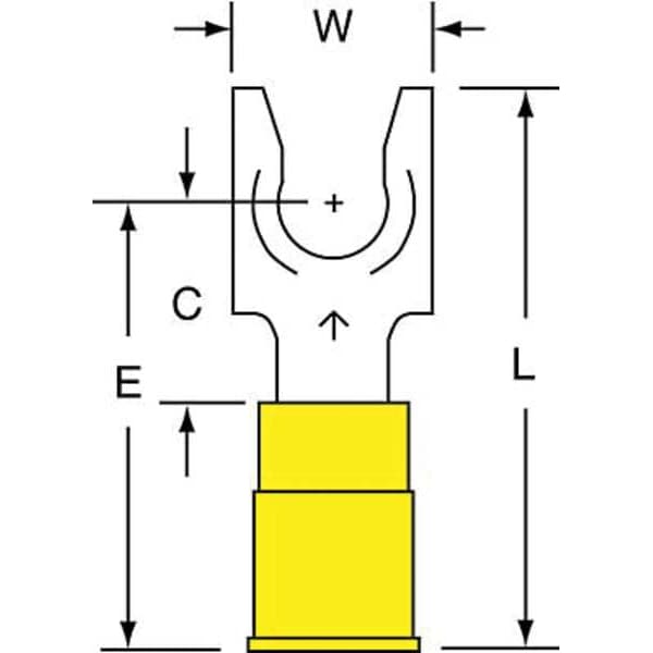 Fork Terminals, Contact Material Copper, Insulation Color Yellow, Insulation Material Nylon, Maximum Temperature 221 Degrees F, Maximum Voltage 600 V, Maximum Wire Size 10 AWG, Stud Size 1/4 in, Termination Style Crimp, RoHS Compliant Yes, Seam Style Butted, Standards CSA Certified, UL Listed, Barrel Length 0.55 in, Barrel Style Insulation Grip, Connection Material Copper, Connection Type Crimp, Minimum Wire Size 12 AWG, Overall Length 1.24 in, Package Quantity 500