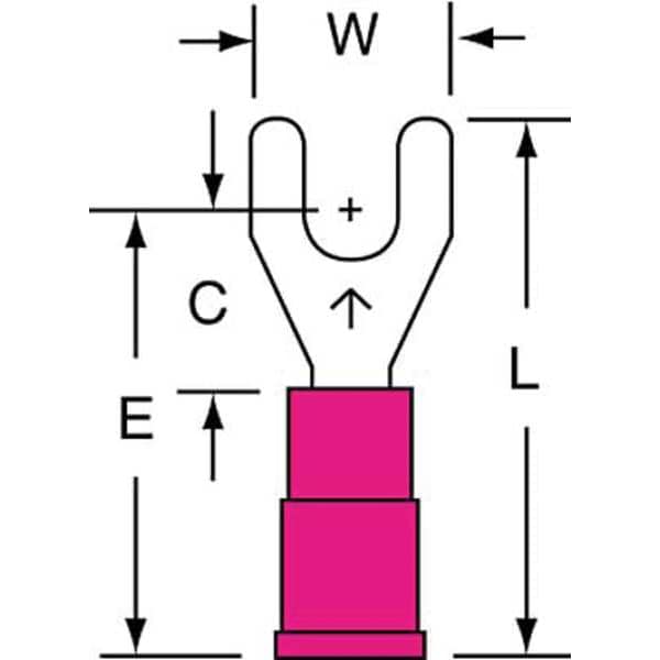 Fork Terminal, Insulation Color Red, Stud Size #6, Standards CSA Certified, UL Listed, Connection Material Copper, Connection Type Crimp, Insulation Type Vinyl, Overall Length 0.9 in, Package Quantity 1000