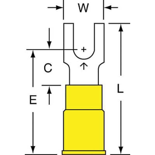 Fork Terminals, Contact Finish Tin, Contact Material Copper, Insulation Color Yellow, Insulation Material Nylon, Maximum Temperature 221 Degrees F, Maximum Voltage 600 V, Maximum Wire Size 10 AWG, Stud Size #8, Termination Style Crimp, RoHS Compliant Yes, Seam Style Butted, Standards CSA Certified, UL Listed, Barrel Length 0.55 in, Barrel Style Insulation Grip, Connection Material Copper, Connection Type Crimp, Minimum Wire Size 12 AWG, Overall Length 1.03 in, Package Quantity 500