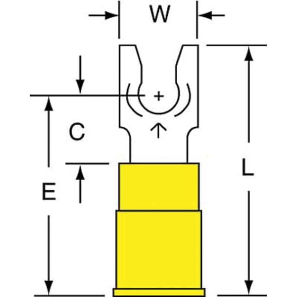 Fork Terminals, Contact Finish Tin, Contact Material Copper, Insulation Color Yellow, Insulation Material Nylon, Maximum Operating Temperature 221 Degrees F, Maximum Voltage 600 V, Maximum Wire Size 10 AWG, Stud Size #8, Termination Style Crimp, RoHS Compliant Yes, Seam Style Butted, Standards CSA Certified, UL Listed, Barrel Length 0.55 in, Barrel Style Insulation Grip, Connection Material Copper, Connection Type Crimp, Minimum Wire Size 12 AWG, Overall Length 1.03 in, Package Quantity 500