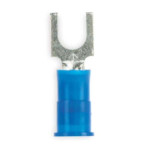 Fork Terminal, #8 Stud Size, 14 AWG, 600 V, Nylon Insulated, Blue, Crimp Termination Only, 100 PK