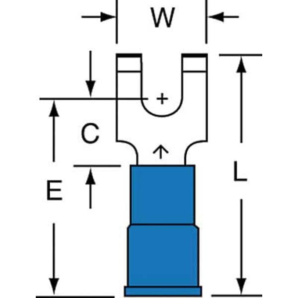 Fork Terminals, Contact Finish Tin, Contact Material Copper, Insulation Color Blue, Insulation Material Nylon, Maximum Temperature 221 Degrees F, Maximum Voltage 600 V, Maximum Wire Size 14 AWG, Stud Size #8, Termination Style Crimp, RoHS Compliant Yes, Seam Style Butted, Standards CSA Certified, UL Listed, Barrel Length 0.46 in, Barrel Style Insulation Grip, Connection Material Copper, Connection Type Crimp, Minimum Wire Size 16 AWG, Overall Length 0.86 in, Package Quantity 1000