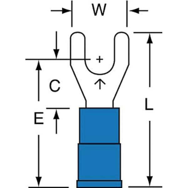 Fork Terminals, Contact Finish Tin, Contact Material Copper, Insulation Color Blue, Insulation Material Vinyl, Maximum Temperature 221 Degrees F, Maximum Voltage 600 V, Maximum Wire Size 14 AWG, Stud Size #8, Termination Style Crimp, Seam Style Brazed, Standards CSA, RoHS 2011/65/EU, UL, Barrel Length 0.25 in, Barrel Style Brazed, Connection Material Copper, Connection Type Crimp, Minimum Operating Temperature -40 Degrees F, Minimum Wire Size 16 AWG, Overall Length 0.9 in