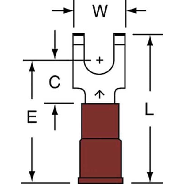 Fork Terminals, Contact Finish Tin, Contact Material Copper, Insulation Color Red, Insulation Material Nylon, Maximum Temperature 221 Degrees F, Maximum Voltage 600 V, Maximum Wire Size 18 AWG, Stud Size #8, Termination Style Crimp, RoHS Compliant Yes, Seam Style Butted, Standards CSA Certified, UL Listed, Barrel Length 44 in, Barrel Style Insulation Grip, Connection Material Copper, Connection Type Crimp, Minimum Wire Size 22 AWG, Overall Length 0.84 in, Package Quantity 1000