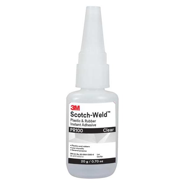 Instant Adhesive, Adhesive Color Clear, Container Size 0.71 fl oz, Container Type Bottle, Cure Method Humidity, Maximum Viscosity 110 cps, Minimum Viscosity 70 cps, Series PR100, Built-in Dispenser Type Dropper, Features Impact Resistant, Shock Absorption, Materials Bonded Cardboard, Ceramic, Cork, Fabric, Felt, Vinyl, Glass, Leather, Metal, Paper, Plastic, Foam, Rubber, Wood, Primary Applications Small Joint Assembly, Standards 29 CFR 1910.1200, CFIA, Electrically Insulating No