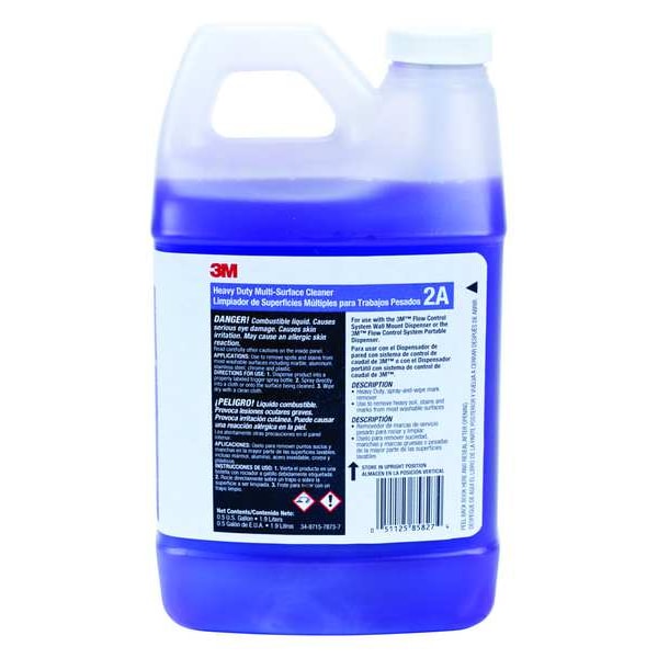 Heavy Duty Multi Surface Cleaner, Label Number 2A, Label Color Coding Purple, Cleaner Form Liquid, Container Size 0.5 gal, Container Type Bottle, Fits Dispenser Series Flow Control, pH Level 11.6, pH Value Alkaline, Primary Chemical Not Applicable, Recommended Dilution 1:13, Concentrated, EPA Registered Yes, Flash Point 185 Degrees F, VOC Content 0 Percent, Fragrance Citrus, Standards 29 CFR 1910.1200, EPA Registered, Surfaces for Use On Aluminum, Carpets, Chrome, Marble, Stainless Steel