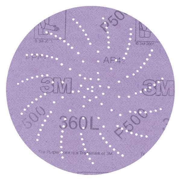 Hook-and-Loop Sanding Disc, Abrasive Type Coated, Abrasive Material Aluminum Oxide, Backing Material Film, Backing Weight 3 mil, Coating Coverage Open, Grade Super Fine, Grit P500, Overall Diameter 3 in, Series 360L, Resistance Properties Load, Number of Vacuum Holes Multi-Hole, Color Purple, Package Quantity 100