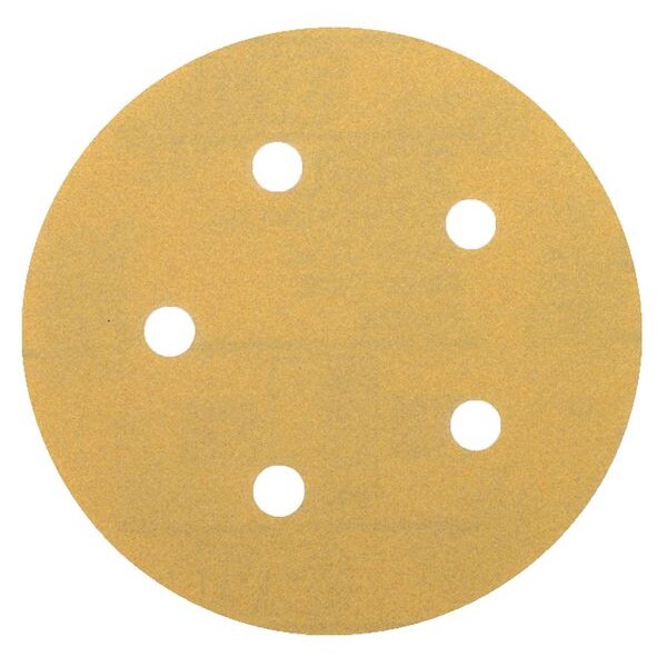Hook-and-Loop Sanding Disc, Abrasive Type Coated, Abrasive Material Aluminum Oxide, Backing Material Paper, Backing Weight A, Coating Coverage Open, Grade Very Fine, Grit P320, Overall Diameter 5 in, Series 216U, Resistance Properties Load, Number of Vacuum Holes 5, Color Gold, Package Quantity 500