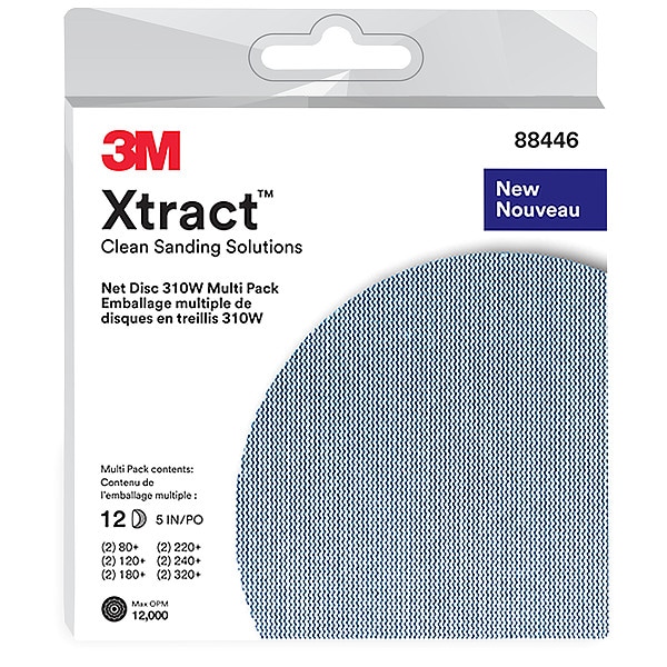 Hook-and-Loop Sanding Disc, Abrasive Type Coated, Abrasive Material Aluminum Oxide, Backing Material Net, Backing Weight Not Applicable, Coating Coverage Open, Grade Coarse, Fine, Medium, Very Fine, Grit 120, 180, 220, 240, 320, 80, Overall Diameter 5 in, Series Xtract 310W, Number of Vacuum Holes Mesh, Color Blue, Package Quantity 20