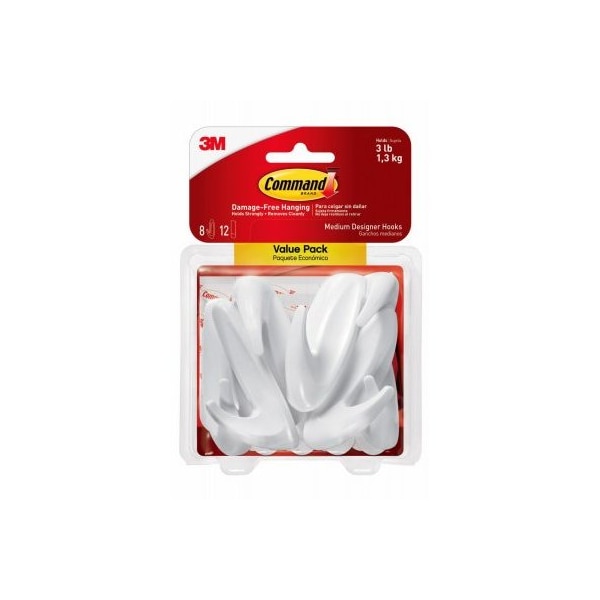 Command Medium Designer Hooks Value Pack White 8 Hooks 12 Strips/Pack