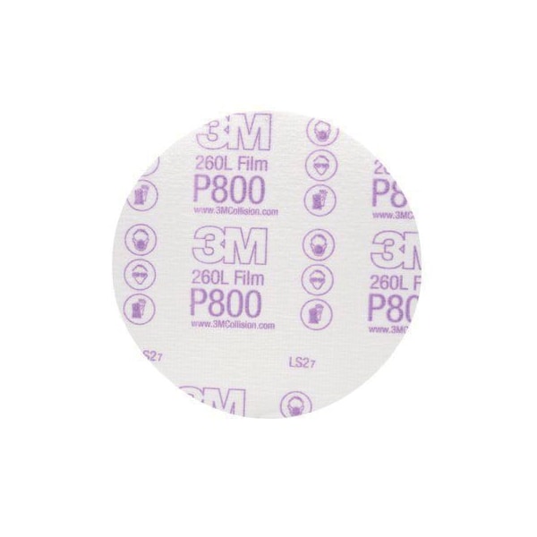 The 3MTM HookitTM Film Disc 260L is ideal for auto body applications including blending, scuffing, paint prep and removing paint defects. Choose aluminum oxide mineral cutting surfaces from P600 to P1500, all on durable film backing. Several versions of the disc feature a 5- or 6-hole design to help keep dust away from the disc surface. HookitTM attachment makes it easy to change and reuse discs. LONG LASTING: Film backing helps provide a fast cut rate and long disc lifeFINE FINISH: The film backing helps provide a fine finish to auto body sanding applicationsMULTI-PURPOSE: Ideal for blend sanding and blending jobsDURABLE: The tear-resistant film backing helps deliver a consistent finishEFFICIENT: The HookitTM attachment system makes it easy to change and reuse discsWIDE GRADE RANGE: HookitTM Film Discs are available in 3-, 5-, and 6-inch discs in grades from P600 to P1500
