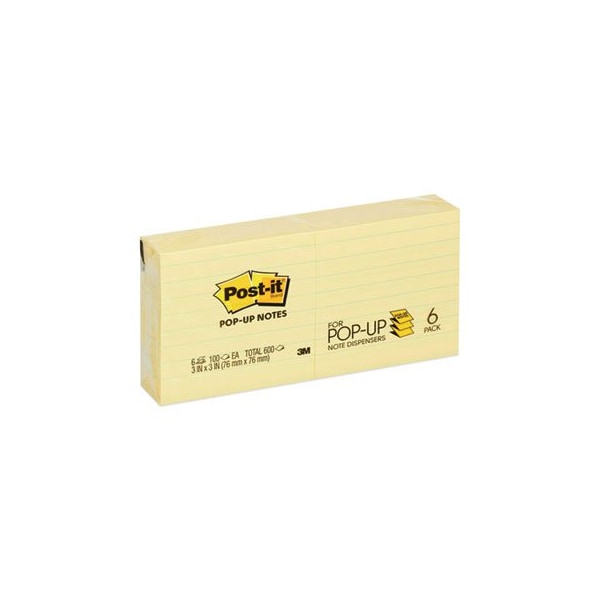 Post-it, Original Canary Yellow Pop-Up Refill, Lined, 3 X 3, 6PK