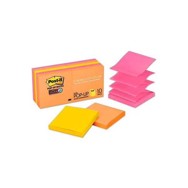 Post-it pop-up notes super sticky pop-up notes rio de janeiro, 3" x 3", 90 sheets, 10/pack post-it super sticky pop-up notes make it easy to grab one note at a time. Super sticky adhesive ensures notes hold stronger and longer, yet remove just as cleanly as original notes. They're the perfect size for leaving notes of encouragement or a quick reminder. Accordion-style notes are made specifically for post-it pop-up dispensers. Post-it super sticky notes are recyclable. this product arrives to most customers in 2-3 business days.