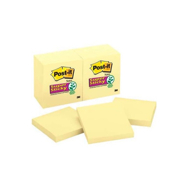 Canary yellow super sticky notes, 3 x 3, twelve 90-sheet pads/pack post-it super sticky notes hold stronger and longer than most self-adhesive notes so you can be sure that your message gets through. Have the confidence to leave important messages on multiple surfaces including computer monitors, office doors, and walls. Perfect size for notes and reminders. Paper used comes from well-managed forests where trees are replanted. 90 sheets per pad. features 3" x 3"; canary sticks to almost any surface and doesn't fall off perfect size for a quick reminder familiar and attention-getting canary notes 90 sheets / pad; 12 / pack this product arrives to most customers in 2-3 business days.