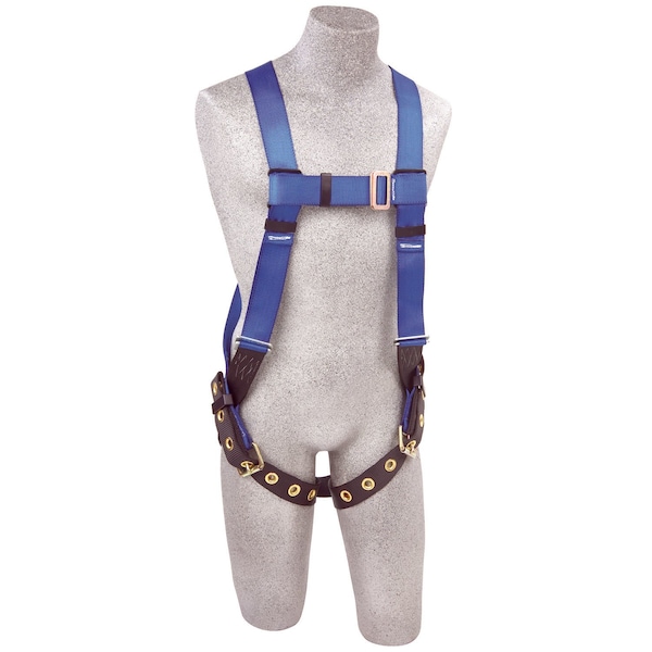 One dorsal D-ring and tongue buckle legs and pass-thru chest closures. 1.75-inch wide polyester web, yellow top, blue bottom. Minimum tensile strength 5,000 pounds. Zinc plated stamped steel. Meets or exceeds OSHA 1926 and ANSI Z359 performance criteria.