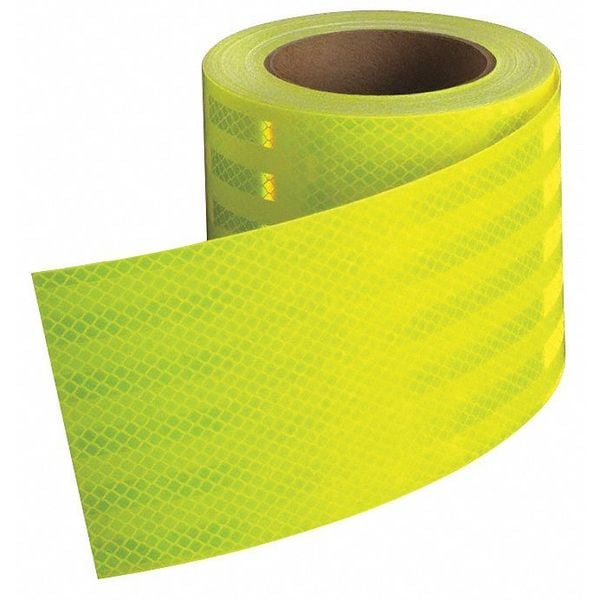Reflective Tape, Reflective Color Fluorescent Lime, Width 4 in, Length 50 yd, Adhesive Material Acrylic, Backing Material Retroreflective Microprismatic Material, Thickness 16 mil, Adhesion Strength 2.5 lb/in (FRP), 3.0 lb/in (Tedlar(R)), 3.0 lb/in (Prepainted Panel), 3.5 lb/in (Aluminum Rail), 5.3 lb/in (Degreased Aluminum), 6.0 lb/in (Stainless Steel), Outdoor