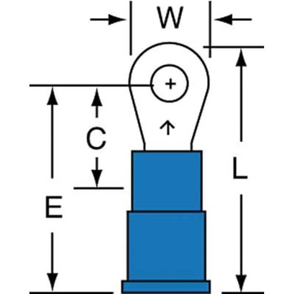 Ring Terminal, Insulation Color Blue, Insulation Material Vinyl, Maximum Temperature 221 Degrees F, Maximum Voltage 600 V, Minimum Wire Size 16 AWG, Maximum Wire Size 14 AWG, Termination Style Crimp, Tongue Width 0.25 in, Contact Finish Tin, Contact Material Copper, Standards CSA, RoHS 2011/65/EU, UL, Barrel Inside Diameter 0.09 in, Barrel Length 0.25 in, Barrel Outside Diameter 0.17 in, Barrel Style Brazed, Hole Spacing 0.13 in, Minimum Operating Temperature -40 Degrees F, Overall Length 0.8 in