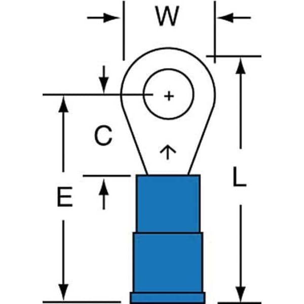 Ring Terminal, Insulation Color Blue, Insulation Coverage Partial Coverage, Insulation Material Nylon, Maximum Temperature 221 Degrees F, Maximum Voltage 1,000 V, Minimum Wire Size 16 AWG, Maximum Wire Size 14 AWG, Termination Style Crimp, Tongue Width 0.33 in, Contact Finish Tin, Contact Material Copper, Standards CSA Certified, UL Listed, Barrel Inside Diameter 0.09 in, Barrel Length 0.25 in, Barrel Style Butted, Compatible with Product Type Building Wire, Fixtures or Luminaires, Signs