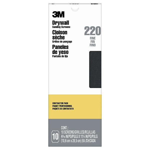 Sanding Sheet, Abrasive Type Coated, Abrasive Material Silicon Carbide, Backing Material Screen, Backing Weight Not Applicable, Coating Coverage Open, Grit 220, Series Drywall Sanding Screens, Overall Length 11 1/4 in, Overall Width 4 3/16 in, Resistance Properties Water, Attachment Type Not Applicable, Package Quantity 10