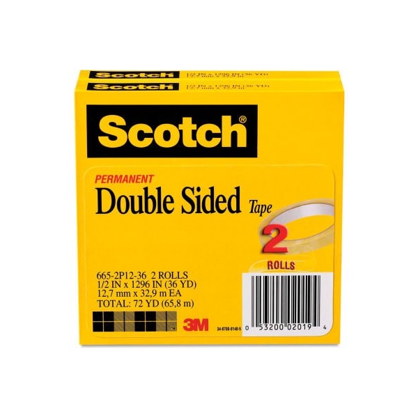 Scotch 665 double-sided tape, 1/2" x 1296", 3" core, transparent, 2/pack choose scotch double sided tape for the satisfaction of a job well done. It's a neater alternative to messy glues that will keep your hands and workspace clean. The tape's double-sided adhesive attaches your documents to poster boards or layouts without showing for a more polished presentation. It pulls easily off the roll and cuts cleanly to the length you need for any project. There is no liner to dispose of so you enjoy frustration-free taping. When you want to make a good impression, choose the smart, no-show solution. Tape type: double-sided; width: 1/2; size: 1/2" x 1296"; core size: 3"." larger quantity quotes available. Please call 1-888-978-7759. this product arrives to most customers in 2-3 business days.