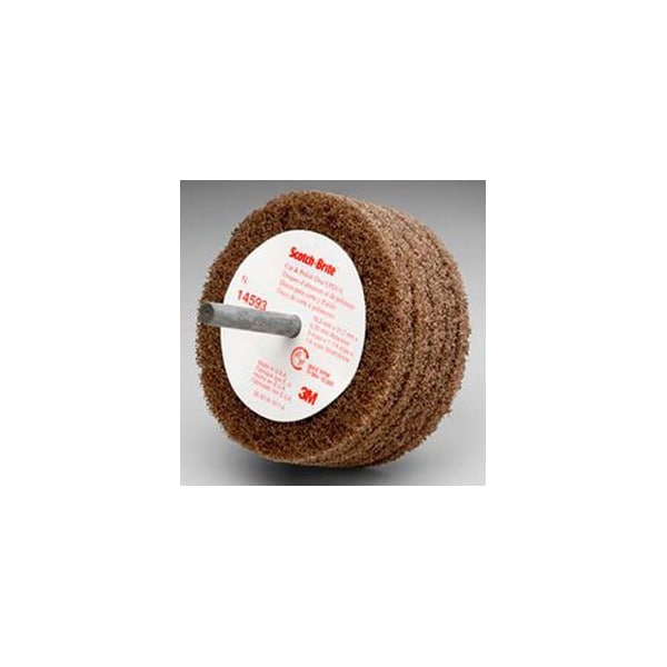 3M scotch-brite cut and polish disc d5 3in x 1 1/4in aluminum oxide a med our scotch-brite cut and polish disc d5 uses a durable, non-woven, open-web construction is load resistant, runs cool, and provides conformability while the aluminum oxide abrasives work to deliver consistent cutting action. The 1/4in shank is suitable for power tools with a 1/4in drive, die grinders, and inline sanders. We chose aluminum oxide abrasive, which is a popular choice among industrial professionals because of its cut-rate and long life. This mineral is a tough, durable abrasive that self-fractures to expose fresh cutting edges in use, whereas traditional abrasives, such as garnet, quickly wear down with use. Due to its high cut-rate, hardness, strength, and low heat retention, aluminum oxide mineral is widely used in grinding applications in addition to sanding and finishing use. Aluminum oxide is suitable on a wide variety of substrates in both woodworking and metalworking, including ferrous alloys. Our scotch-brite industrial abrasives are a unique surface conditioning product with abrasives incorporated into non-woven nylon or other synthetic fibers. Combining abrasives into the fibers creates an abrasive system that delivers consistent results for the life of the product. The open-web material is load resistant and keeps the abrasive minerals cutting at high performance by limiting clogging of the fibers. Applications are fine finishing, finishing, refining, straightline - brushed finish builders hardware, medical instruments, metal fabrication, metal implants, plumbing fixtures, turbine engines. Industries include builders hardware, medical instruments, metal fabrication, metal implants, plumbing fixtures, turbine engines.