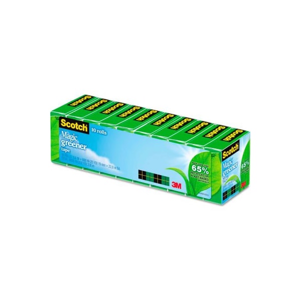 Scotch magic greener tape, 3/4" x 900", 1" core, 10/pack alternate version of the original magic tape contains a minimum of 53% plant-based materials by weight. Write on it with pen, pencil or marker. Appears invisible when applied. Photo safe determined in accordance with iso standard 18916. Tape type: invisible; width: 3/4"; size: 3/4" x 900"; core size: 1". this product arrives to most customers in 2-3 business days.