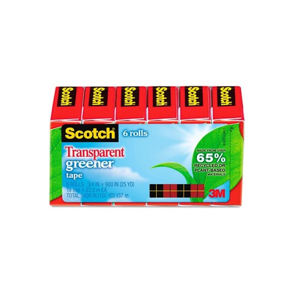 Scotch transparent greener tape, 3/4" x 900", 1" core, 6/pack contains both plant-based and recycled materials. Designed for multi-purpose sealing applications and label protection. Instant adhesion and excellent holding power. Clear when applied, will not yellow with age. Photo safe as determined in accordance with iso standard 18916. Tape type: transparent; width: 3/4"; size: 3/4" x 900"; core size: 1". this product arrives to most customers in 2-3 business days.
