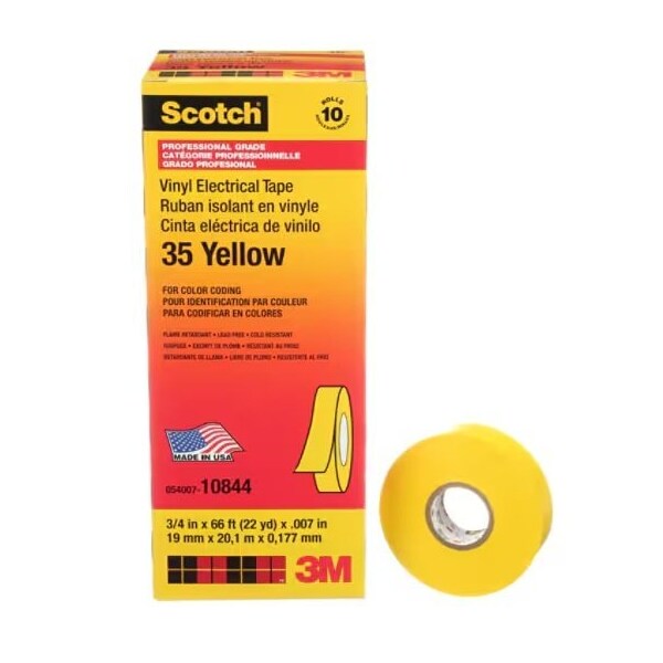 Scotch Vinyl Color Coding Electrical Tape 35, 3/4 in x 66 ft, Yellow, 10 rolls/carton