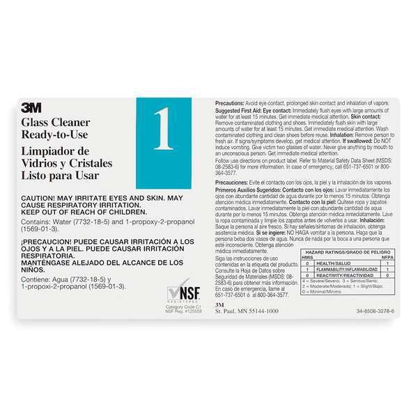 Secondary Bottle Label, Height 11 in, Width 8 1/2 in, Material High Gloss Paper, Legend 3M Glass Cleaner 1, Package Quantity 12