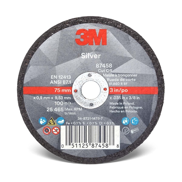 3M Precision-Shaped GrainsThe 3M Silver Cut-Off Wheel features 3M Precision-Shaped Grain which continually fractures into super-sharp points and edges that slice cleanly through metal, rather than gouging or plowing as traditional abrasives do. This also helps it to last significantly longer than conventional ceramic grain abrasives while maintaining a high cut-rate over the life of the wheel. _x000D_