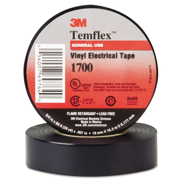 3MTM Temflex Vinyl Electrical Tape 1700 69764, 0.75" x 60 ft, Black
