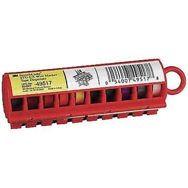 Wire Marker Dispenser, Colored Tape, Material Polyester film tape, Temp. Range 32 Degrees to 120 Degrees F, Label Width 0.215 in, Marker Attachment Style Pre-printed, Label Material Polyester Opaque Film, Legend Color One each of black, blue, brown, green, gray, orange, red, violet, white and yellow, Uses Dispenser Included, Rolls per Legend 1, Standards RoHS 2011/65/EU, Package Quantity 10