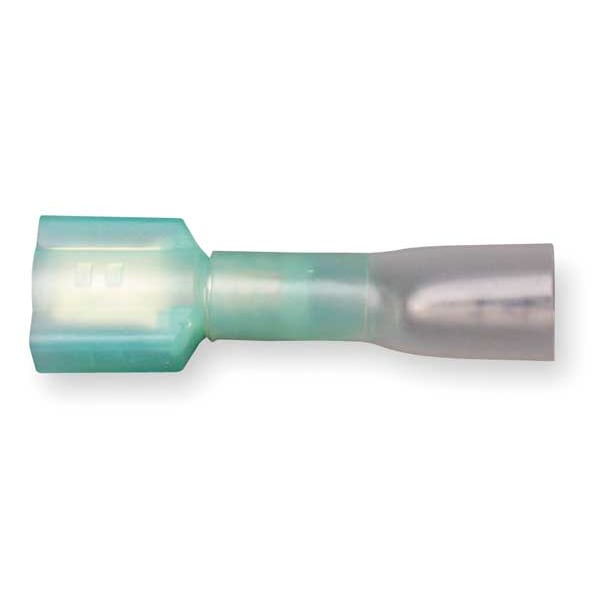Male Disconnect, Contact Material Brass, Insulation Color Blue, Insulation Coverage Full Coverage, Maximum Operating Temperature 221 Degrees F, Minimum Wire Size 16 AWG, Maximum Wire Size 14 AWG, Maximum Voltage 600 V, Tab Thickness 0.032 in, Tab Width 0.25 in, Terminal Type Male Disconnect, Termination Style Crimp, Seam Style Butted, Standards CSA Certified, RoHS Compliant, UL Listed, Barrel Inside Diameter 0.085 in, Insulation Type Heat Shrink, Overall Length 1.2 in, Package Quantity 25