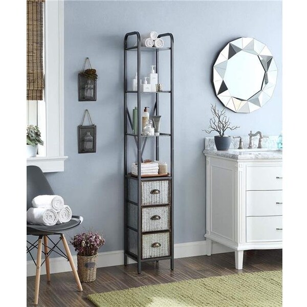 What a great storage unit for any room in the home! This storage tower has a total of two fixed shelves of which are galvinized metal, to retain a more industrial look. The unit also has three corrugated metal drawers are easy to pull out for that additional storage for any of your nick knacks. The storage tower fits nicely in any bedroom, kitchen, bathroom or any room in the home where added storage is needed! With hand crafted rounded uprights it gives this space saver the soft designer look you that you would find in the many designer stores. The metal is finished with a powder coated system that makes it resistant to many of the harsh elements in the bathroom. The scissor metal back adds additional strength to this space saver and makes it a great fit for your bathroom. Constructed of metal. Clean with a dry non abrasive cloth. Assembly required Intek Tower with Three Drawers - Metal.