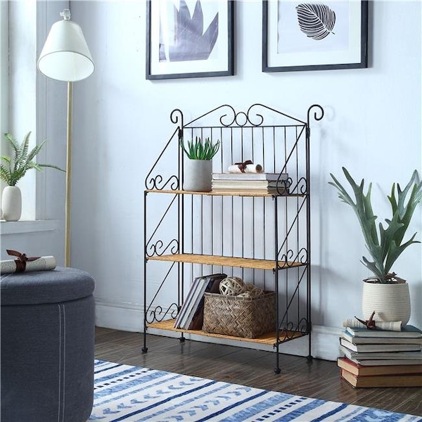 Great accent to any home Folding 3-tier rectangular wicker and iron shelves Attach the three wicker shelves with six screws and bolts Decorative black metal back and sides fold open Wicker shelves fold into place on the uprights Perfect accent piece for the bathroom kitchen bedroom family room-any room of the house! 9.8"D x 22.8"W x 37"H.