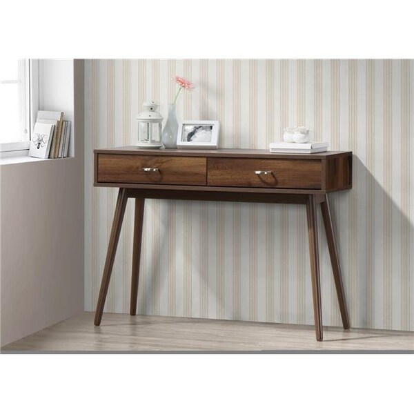 Working has not been so much fun but when you have a desk like this you won't mind working at this attractive desk. Designed in a mid-century modern style, it features shaped tapered legs, square handle drawer pull, and a walnut finish. There's plenty of clean surface space for you to tackle the task at hand, while two drawers ,that open on metal slides, provide accessible storage, Easy assembly required.