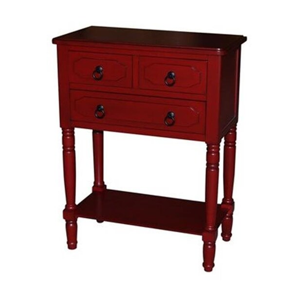 3 Drawers. Shaped Drawer Fronts. Metal Pull Hardware. Shaped Legs With Decorative Carvings. Adjustable Shelves: Yes. Finish: Antique Red. Finish Family: Red. Number Of Drawers: 3. Number Of Shelves: 1. Portion Of Product Made From Wood (%): 99. Depth: 13". Height: 30.7". Width: 23.6".